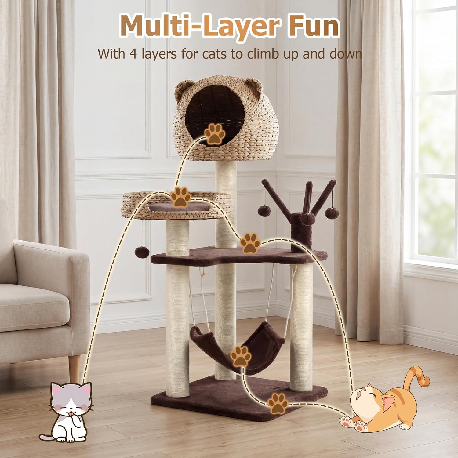 DescriptionWhether your kitty wants to scratch, rest, play or sleep, there's never a dull moment in this multi-level cat tree!Curious cats will love exploring the multi-level tree, which offers different sleeping positions, a hiding place and a place to redirect their scratching instincts. The scratching posts help cats scratch their nails and prevent damage to furniture. This cat tower also includes jingling toy balls for hours of playtime fun. Aiming to provide a safe living environment for your pet, our cat activity center is made of selected materials: engineered board, natural sisal ropes and durable cattail. The entire structure is stable and strong enough for cats to jump and play on. Last but not least, the cat tree is covered with soft & comfortable plush for extra comfort and style. The beautiful cat-shaped look will make the cat playhouse be the perfect match for your home decor.FeatureMultiple-level design for a variety of ways to scratch, play, rest and sleepA comfy cat condo gives your kittens a private space to nap and hideHanging hammock is a great spot to enjoy some relaxation after getting exerciseThe posts are wrapped by natural sisal ropes that are durable and safe for kittensThe strong scratching posts are good for cats to exercise and sharpen their clawsSoft and comfortable plush covering offers cats warm lounging experienceSafe round corners will protect kittens from accidental hurtThe wide and stable base provides strong support, and not easy to wobbleSpecificationColor: Natural/BrownMaterial: Cattail Fluff, Sisal Rope, Engineering Board, Plush, Polyester FabricOverall Dimensions: 19.5” x 19.5” x 48” (L x W x H) Size of the Cat Condo: 14.5” x 13” (Dia. x H)Diameter of the Cat Bed: 15.5”Weight Capacity of Each Layer: 33 lbsNet Weight: 23.5 lbsPackage Includes:1 x Cat Tree1 x User’s Manual